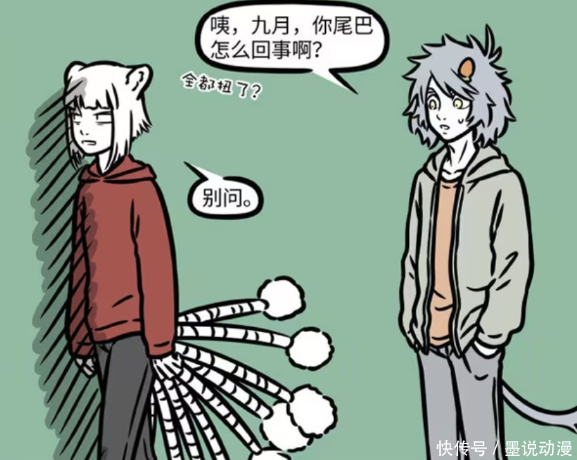 《非东说念主哉》漫画版中,九月偶尔会去顾问尾巴,她原来念念要狐仙般的嗅觉,然而因为太过丝滑,导致生计有诸多未便,以致严重到影响就寝。九月原来念念恢规复来的表情,然而最终只可让尾巴打结。