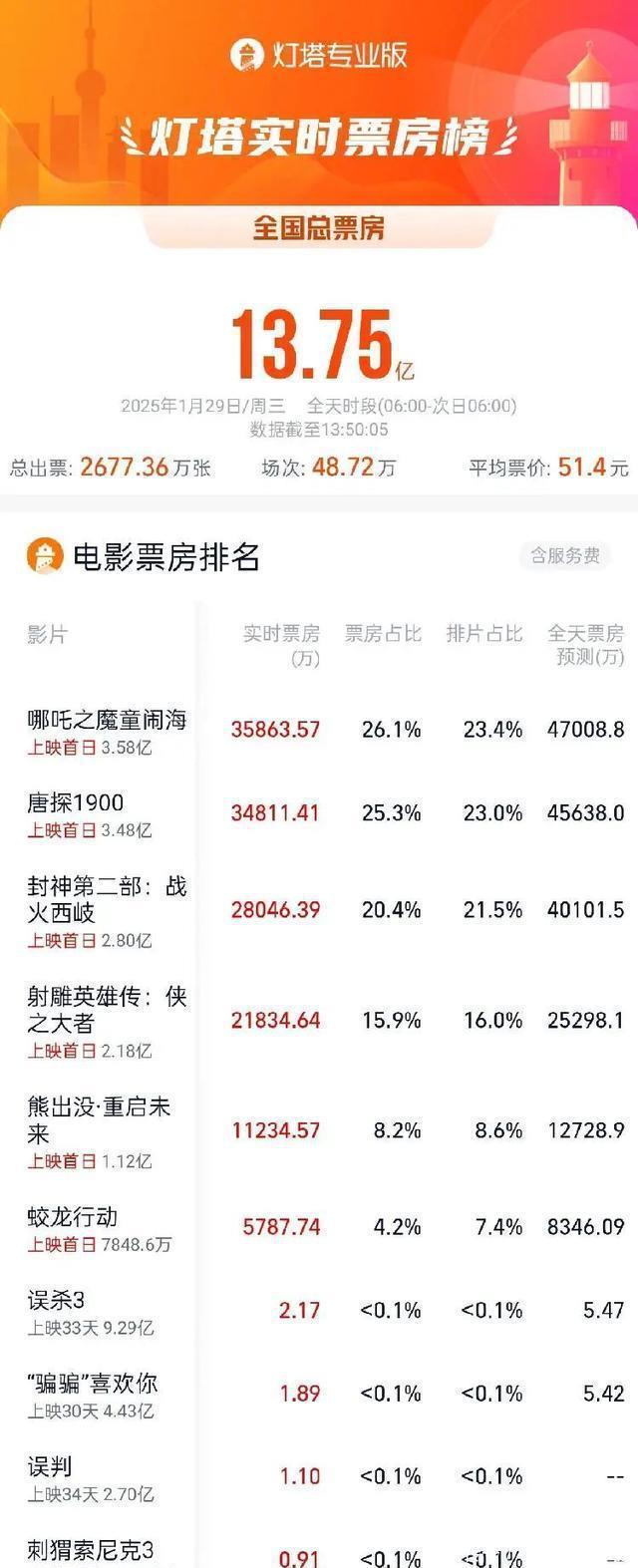 法例1月29日13时50分,2025年大年月吉大盘票房达13.75亿