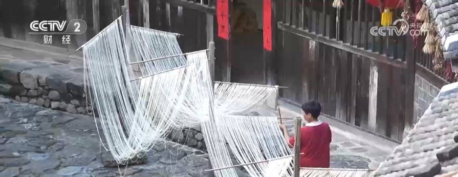 不仅要晒秋,按照当地的传统,秋分骨气前后,还要“食秋”,吃的即是当地的一些传统特色好意思食。这是传统的客家线面,这谈好意思食的脾性即是细如丝线,因此“拉线”是制作线面最中枢的一步。老乡们要将线面缠绕在一根固定的竹竿上,再抓住另一根竹竿,向外拉抖面条,直到把小拇指粗的面条一皆拉到丝线般细为止。接着还要把线面挂在面架上曝晒,千丝万缕的线面在阳光下细若银丝,远远望曩昔,仿佛一层层白纱。