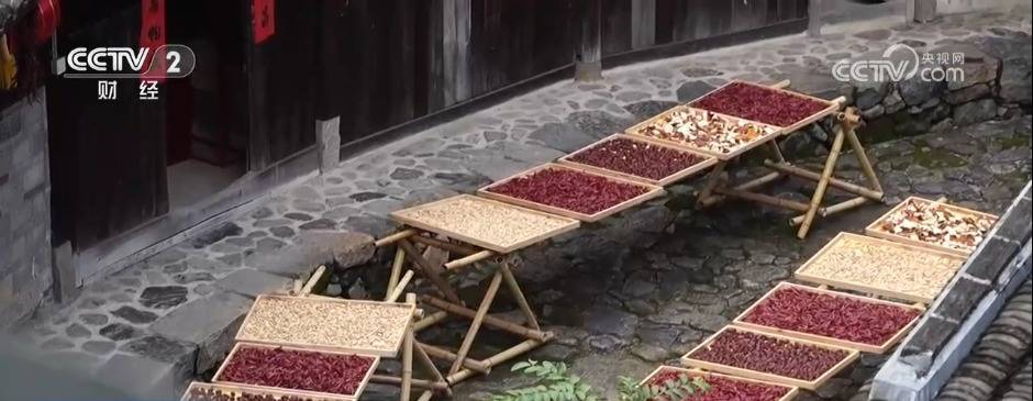 土楼晒秋都晒些什么?全球来看,在记者身旁的晒架上有辣椒、陈皮、玉米、红枣等,在另一个竹匾里还晒着一个个情态瑰丽的柿子。