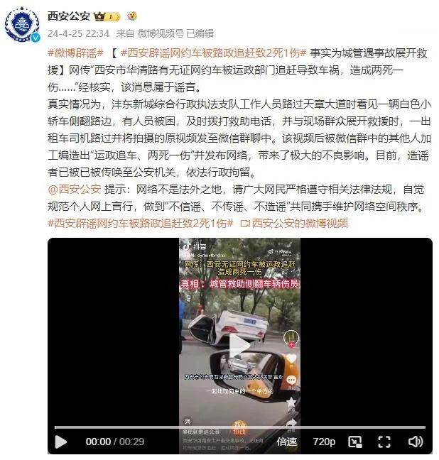 实在情况为,沣东新城轮廓行政国法支队责任主说念主员途经天章正途时看见一辆白色小轿车侧翻路边,有东说念主员被困,实时拨打挽回电话,并与现场寰宇张开赈济时,一出租车司机途经并将拍摄的原视频发至微信群聊中。该视频后被微信群中的其他东说念主加工诬捏出“运政追车、两死一伤”并发布集聚,带来了极大的不良影响。当今,责备者已被已被传唤至公安机关,照章行政拘留。
