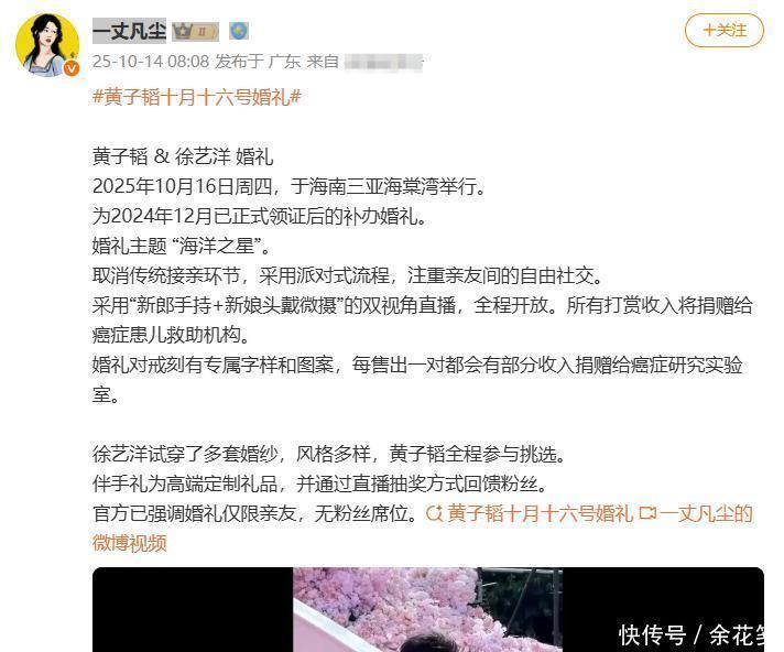 此前,牙东谈主就向媒体表露,黄子韬可能在10月16日补办婚典,近日这则音信再次通过一众网友获取证实。