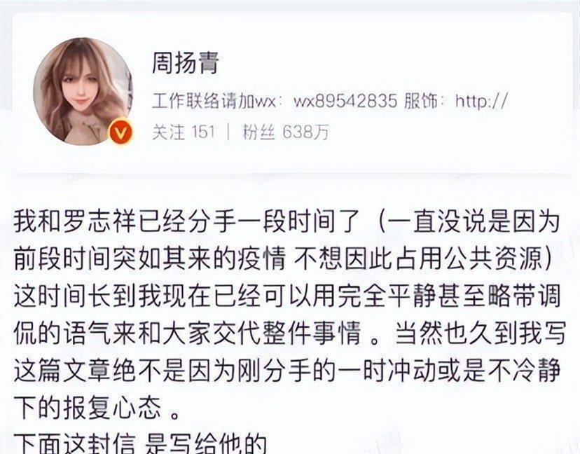 2020年,周扬青通过一篇长文,澈底揭露了罗志祥的负面信息,让其堕入宽广的公论风云。