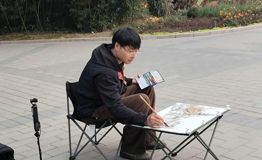 付闻博接管了龙潭公园西北门位置,这里有面子的仿古设立,还有几棵极具秋景代表性的树木。在裕如详情构图前,他先用淡墨勾画出主要结构,作念到心腹知彼。跟着笔尖流转,一幅秋日龙潭图渐次成型:画面右侧,青瓦翘檐的仿古设立杂沓排布,灰白的墙体衬着雕花门窗,飞檐的线条舒展灵动,尽显古建的细腻韵味;左侧几株树木占据了泰半画面,浓墨勾画的枝干强盛舒展,叶片晕染出金黄、橙红的暖色调,秋意激烈又鲜嫩。远景是大致的石砌路面与低矮围栏,笔触写意任意,将现场景致的中枢魔力精确呈现。
