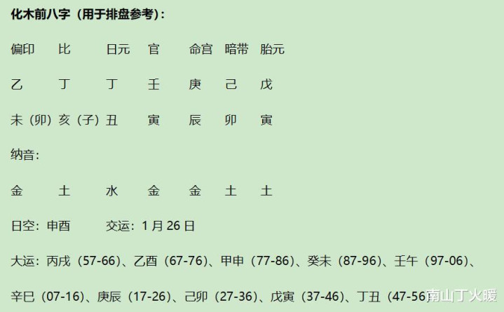 丁日壬时,逢亥月、寅时,为化木格。丁化乙,壬化甲,按照化木格重排八字: