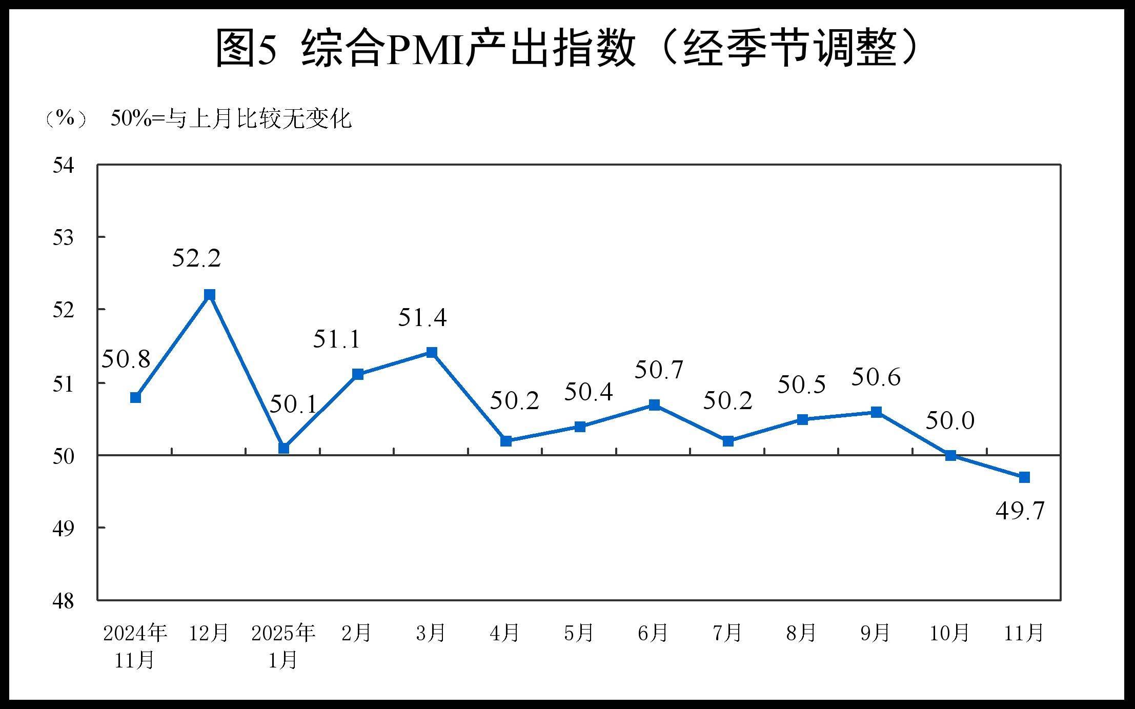 11月份,玄虚PMI产出指数为49.7%,比上月下落0.3个百分点,组成玄虚PMI产出指数的制造业出产指数和非制造业商务手脚指数分袂为50.0%和49.5%。