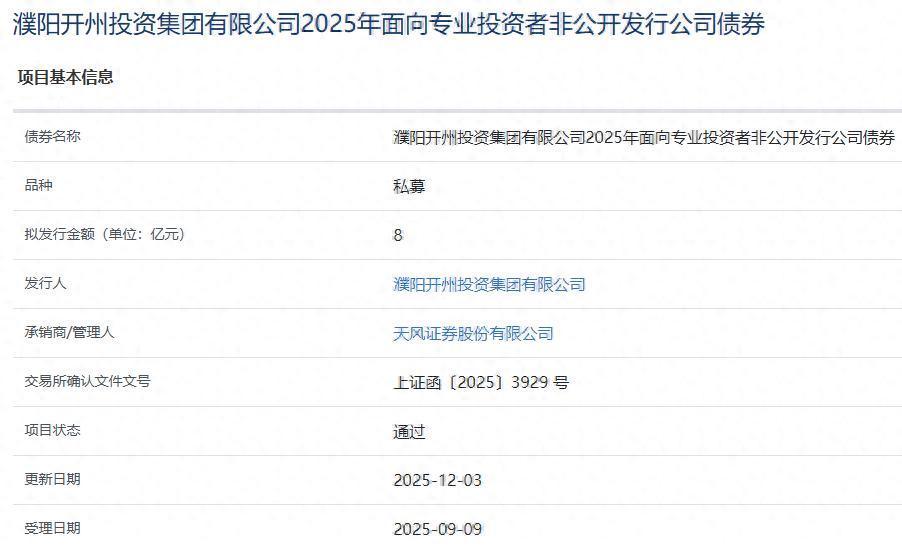 【大河财立方音信】12月3日,濮阳开州投资集团有限公司2025年面向专科投资者非公修复行公司债券获上交所通过。该债券拟刊行金额8亿元,承销商/惩处东谈主为天风证券。2025年6月30日shibo体育游戏app平台,经中证鹏元详细评定,刊行东谈主主体信用评级为AAshibo体育游戏app平台,评级瞻望踏实。