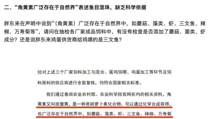 他们还举了一个具体的例子进行对比:胖东来在售卖湿巾时,哪怕划定不彊制,也会主动标出防腐剂等因素;但濒临影响鸡蛋高溢价的角黄素,却以“鲜鸡蛋无国标限量条款”为由,未作任何标注或示知。