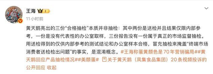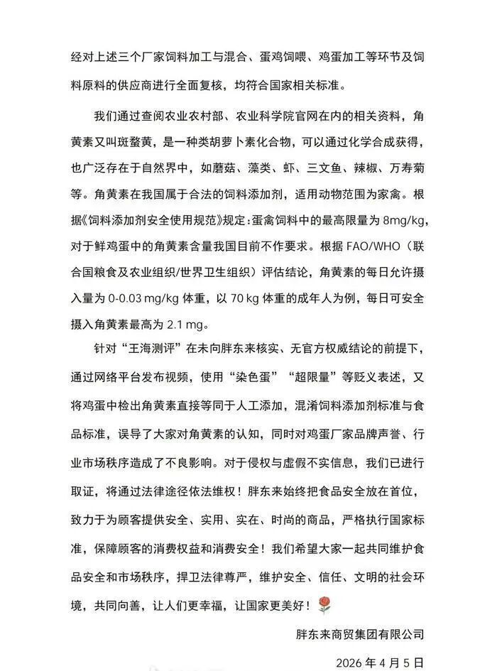 胖东来据此认定产物合规,并责骂王海团队在莫得官方巨擘论断的前提下,使用“染色蛋”等表述,沾污了饲料添加剂范例与食物范例,误导公众。当今胖东来已取证,准备通过法律阶梯维权。
