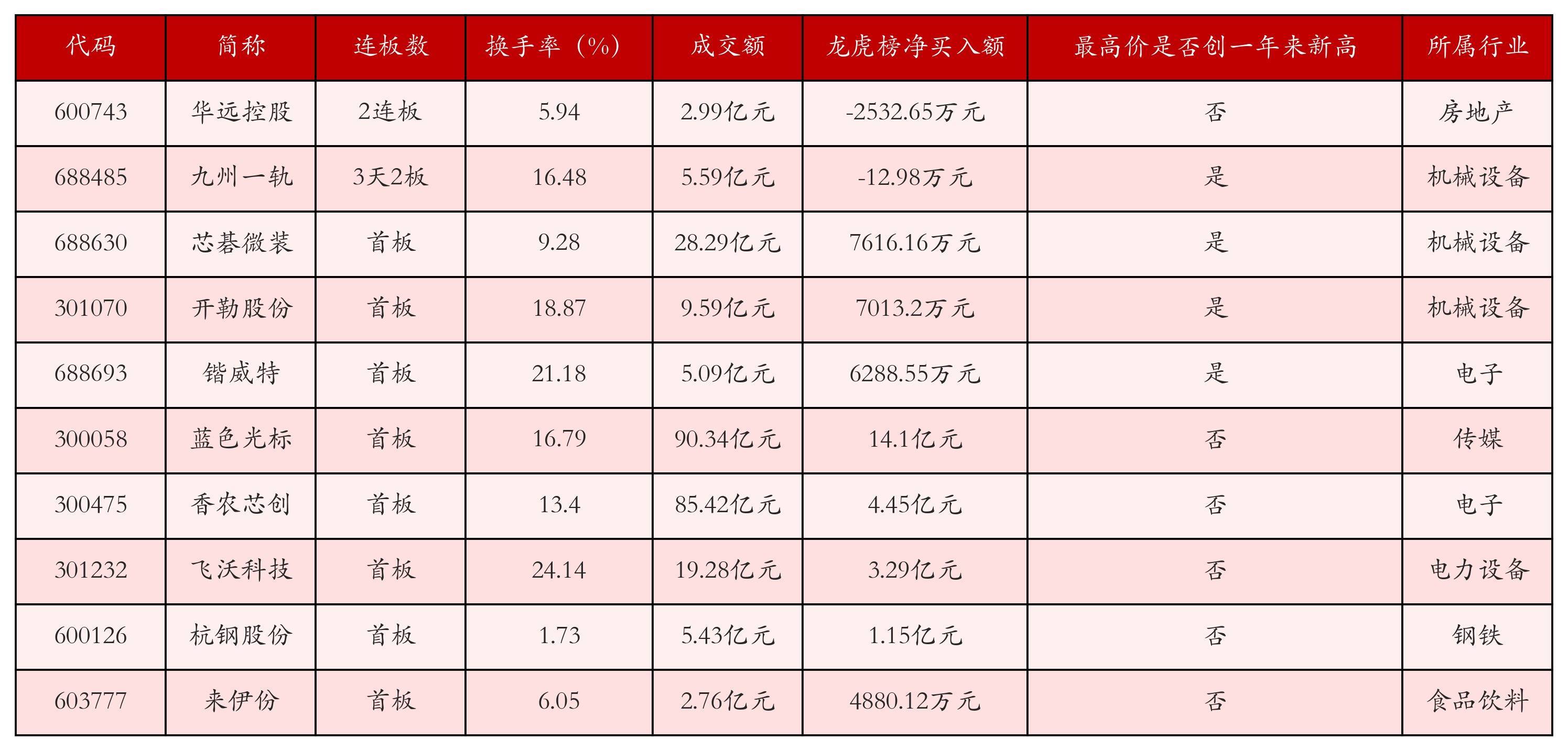 欺压4月8日收盘,上证综指飞腾2.69%,收于3995.0点,深证成指飞腾4.79%,收于14042.5点,创业板指飞腾5.91%,收于3347.61点。本日沪深两市A股筹划134只涨停,详尽现时连板数以及当日龙虎榜数据,其中较为强势的前三只个股分裂为:华远控股(600743)、九囿一轨(688485)与芯碁微装(688630)。本日强势个股前10位具体数据见下表: